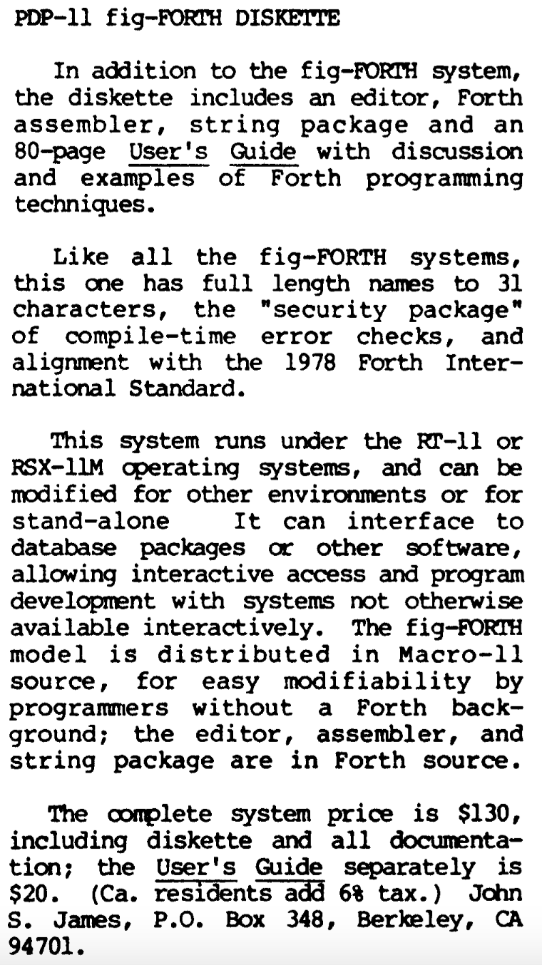 Forth Dimensions, 1:5 Notice | An early mention of the availability of PDP-11 fig-FORTH in Forth Dimensions, vol. 1, no. 5, Jan/Feb 1980, p. 57. This was published just as PDP-11 fig-FORTH version 1.3 was being released. |